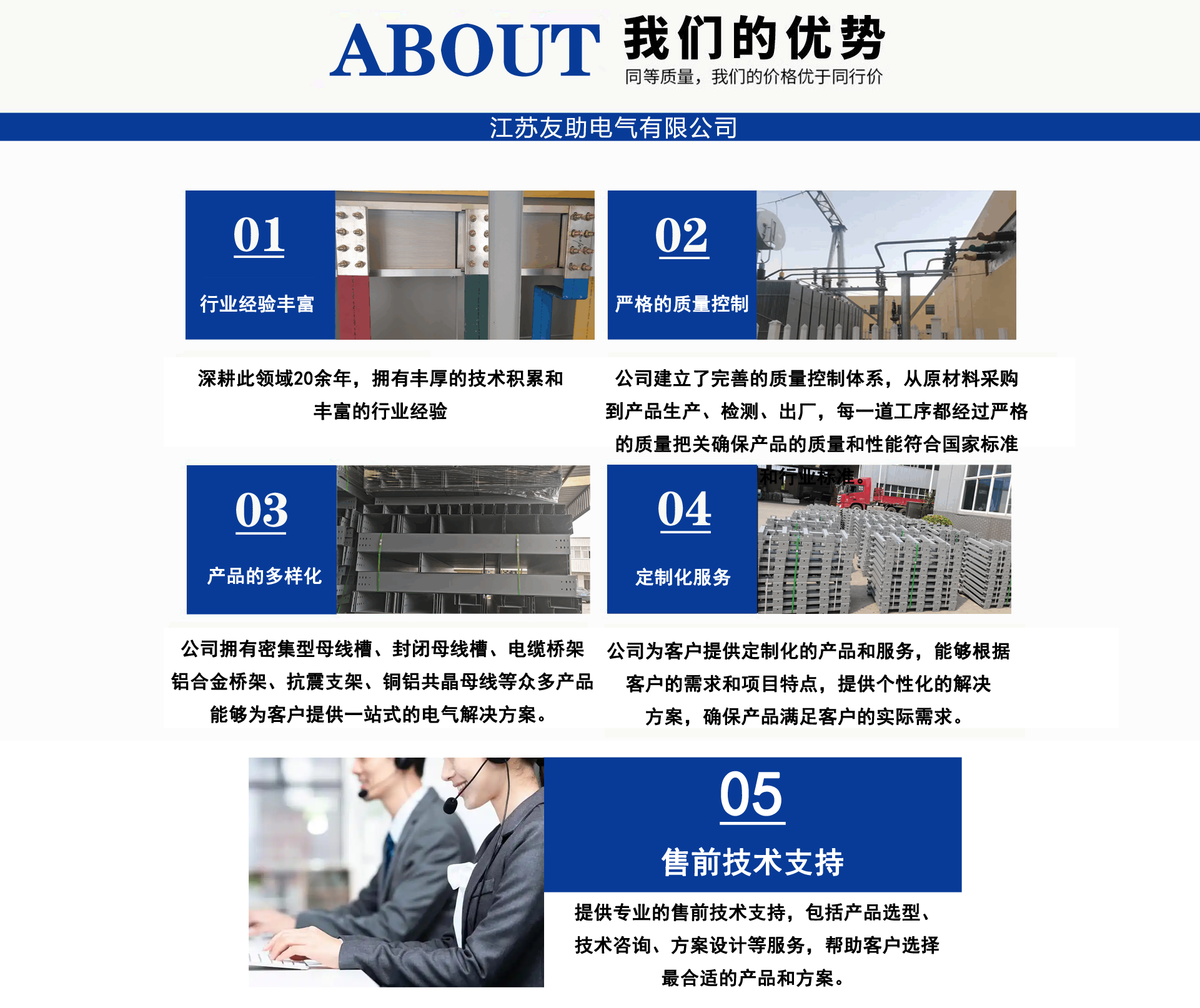 江蘇友助電氣有限公司地處中國工程電氣生產基地-一江蘇省揚中市。經營范圍:電纜橋架,母線槽(橋),管型母線,銅軟連接(伸縮節),高低壓開關柜,配電箱,抗震支架產品系列?!」咀谥迹嚎蛻糁辽稀R殉晒榻K二十屆省運會會場-泰州體育館,南京寶龍商業綜合體,張家口百兆瓦風電場,濟源市婦幼醫院,威海市未來科技園,湖北皇恩燁新材料科技有限公司,南京中央路小學,南通中天大酒店,新疆新安特鋼有限公司,河北省送變電有限公司,南京南微醫學研發基地等多項工程配套服務,我們愿與您精誠合作,互利共贏!公司技術人員深耕橋架,母線領域30年,為您提供橋架,母線槽疑難問題解決方案。母線槽不論每相是單排,雙排,三根排重疊,不管有多少個水平彎、垂直彎,轉接排在發貨前預裝一遍,確保尺寸無誤。到現場直接擰螺絲,效率高,橫平豎直,規規矩矩,符合標準,供電局,業主,監理,驗收易通過。供貨周期3-7天。為了讓尊貴客戶您,設備安全通電,高枕無憂。我們提供如下售前售中售后服務: 售前:免費技術支持,咨詢。 售中:免費現場精確測繪、設計?!∈酆?安裝服務,免費指導。 質量是生命,客戶是源泉。承諾客戶的,一定全力做到。讓我們一起進步!...